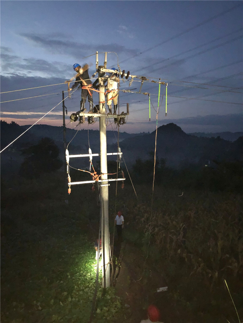 洪水來勢洶洶,雷電和大風并襲,電力受災情況與2018年相比面積更廣、受損更嚴重。泥石流、山體滑坡、房屋倒塌等原因造成倒桿斷線60余處,配電設備受損10余處,15根10千伏埋設電纜線被洪水沖出,來不及搶險的用戶表計40余支,發(fā)輪鎮(zhèn)7號變臺完全被洪水淹沒!6日當晚,供區(qū)內共有11條10千伏線路停電,35千伏孟塘站全站停電。黑暗的雨夜,人民群眾對光明的渴望和需求,讓資中公司電力人的擔子更沉、更重。
