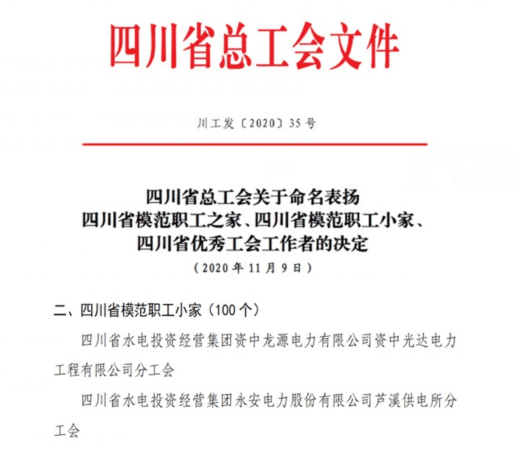 近日,四川省總工會印發了《關于命名表揚四川省模范職工之家、四川省模范職工小家、四川省優秀工會工作者的決定》(川工發〔2020〕35號),四川能投水電集團永安公司蘆溪供電所分工會、資中公司光達工程公司分工會在基層工會組織建設中表現突出,榮獲“四川省模范職工小家”稱號。