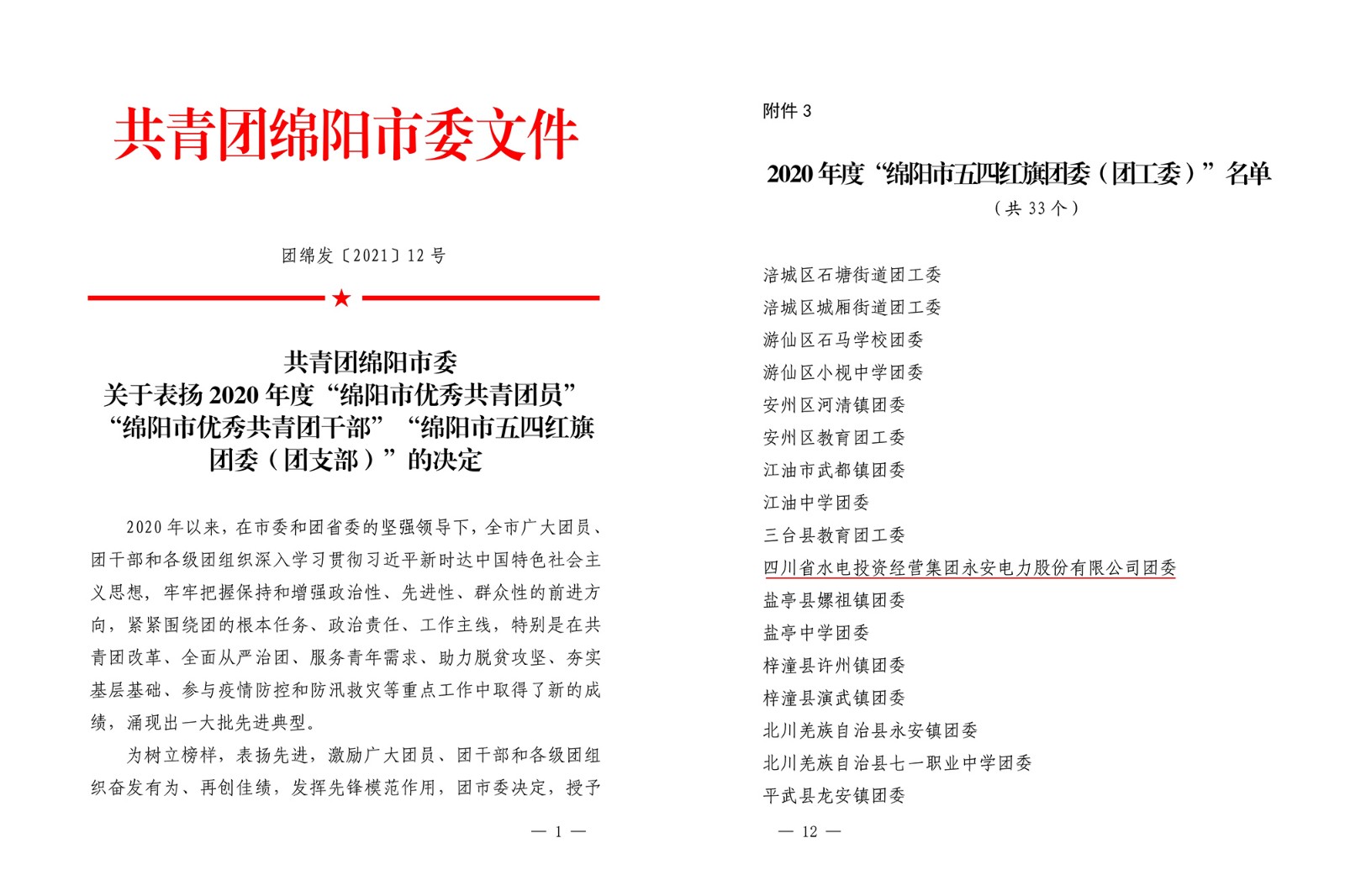 近日,共青團綿陽市委表彰了一批先進個人和先進集體,四川省水電集團永安公司團委榮獲2020年度“綿陽市五四紅旗團委”稱號。