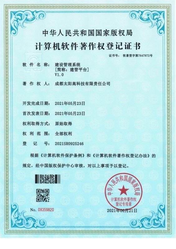 近日,四川省水電集團太陽高科公司自主研發的“建設管理系統”喜獲國家版權局頒發的《計算機軟件著作權登記證書》。