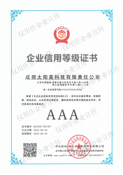 近日,四川省水電集團太陽高科公司成功續評AAA企業信用等級,這是自2017年太陽高科公司首次獲評以來,連續第6年保持企業信用最高評定等級。