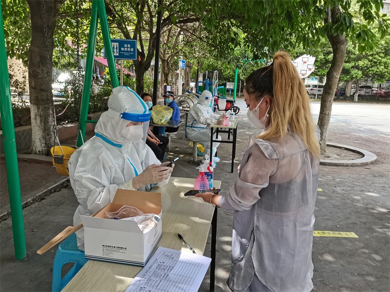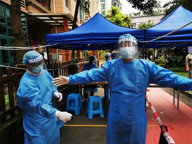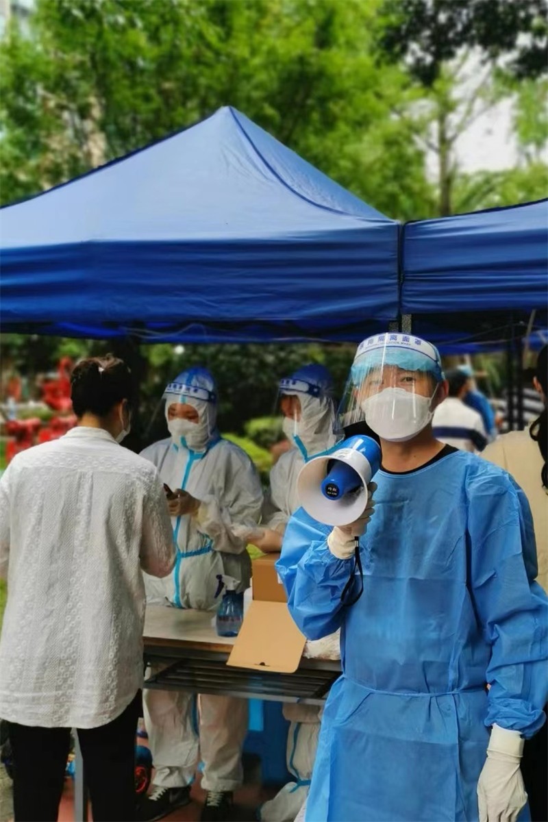 “大爺,要先打開健康碼讓工作人員掃碼后才能做核酸”,有志愿服務工作經歷的雷興洪不厭其煩地回應著居民的詢問。雷興洪第一次參與志愿服務是在2008年的汶川大地震時,當時他還是一名大學生,“如今我已是一名有著9年黨齡的共產黨員,抗疫是我義不容辭的責任。”雷興洪的衣裳已被汗水浸透,在不透氣的隔離服下,彰顯的是忠誠為民的黨員本色。