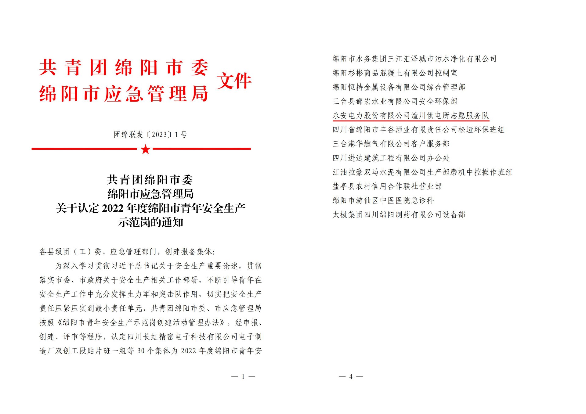 “遵守安全生產法,當好第一責任人”,四川省水電集團永安公司潼川供電所志愿服務隊在安全生產工作中沖鋒在前、擔當在前、奉獻在前,被共青團綿陽市委、綿陽市應急管理局認定為“2022 年度綿陽市青年安全生產示范崗”。
