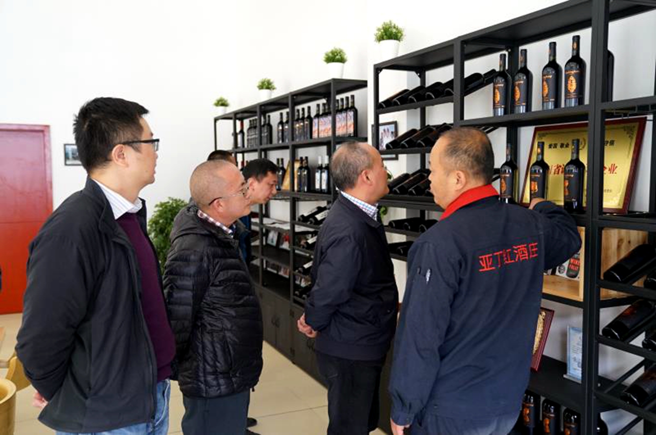 隨后,熊林一行考察了集葡萄種植、葡萄酒生產(chǎn)與銷售于一體的亞丁紅酒莊,參觀了生產(chǎn)車間、酒窖、儲(chǔ)酒區(qū)、庫(kù)房等區(qū)域,了解酒的品質(zhì)、生產(chǎn)經(jīng)營(yíng)、企業(yè)效益、助農(nóng)增收等方面的情況。